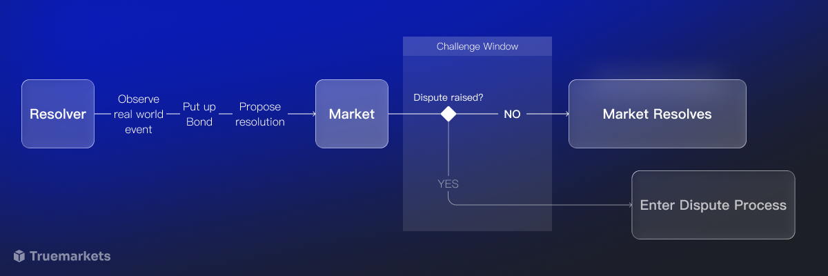 When the resolution criteria have been satisfied, any participant may permissionlessly propose a resolution by posting a bond behind their chosen outcome. This action initiates a 12-hour challenge window during which the proposed resolution may be disputed by others.
